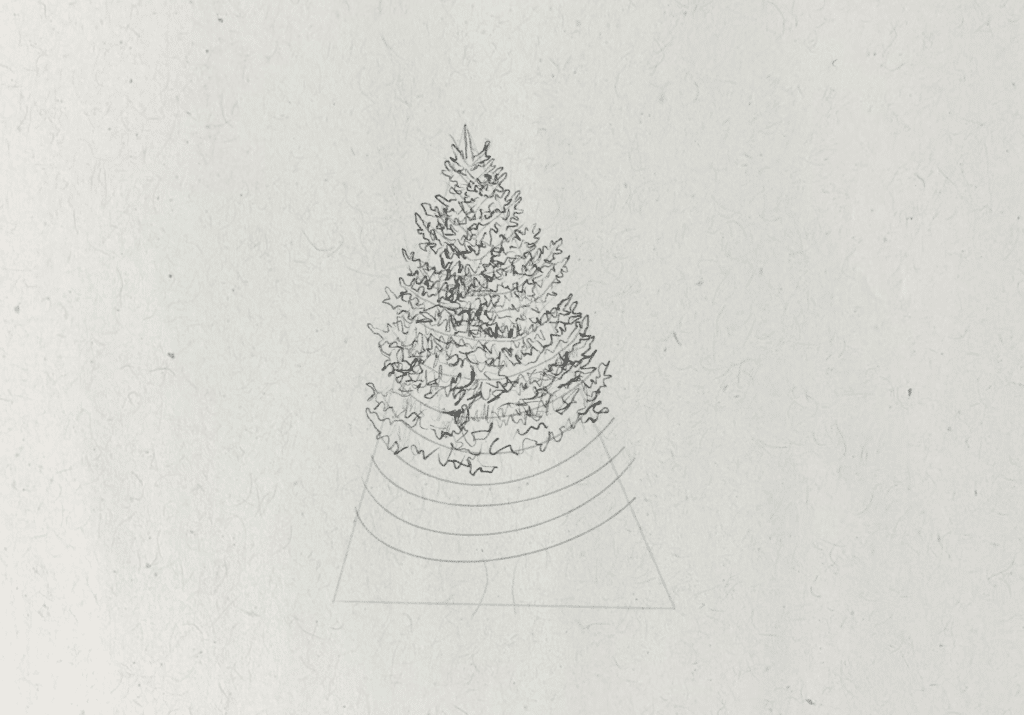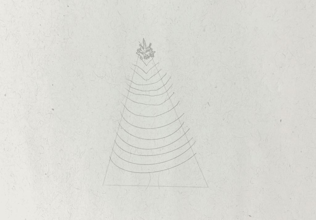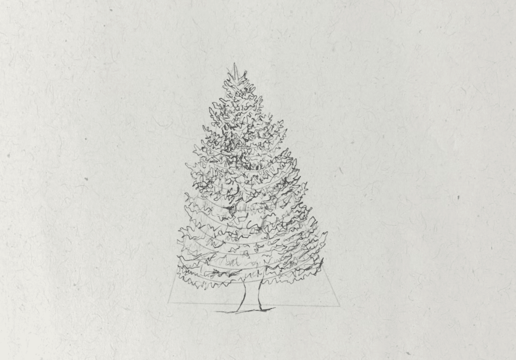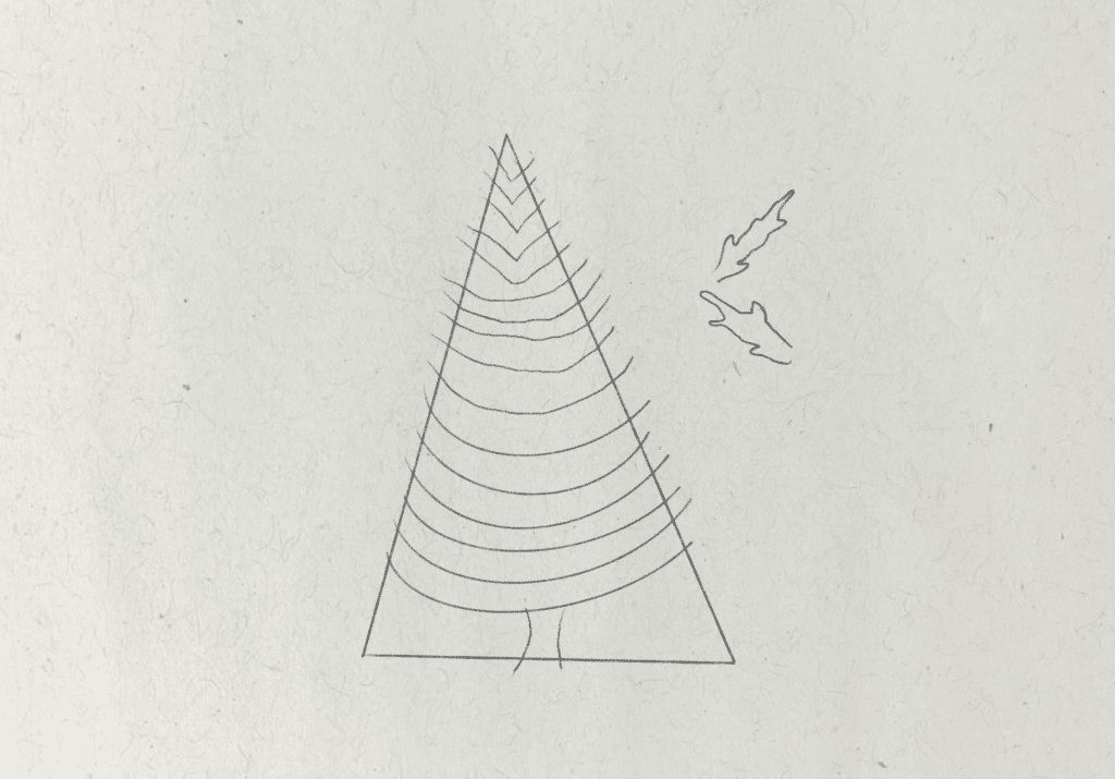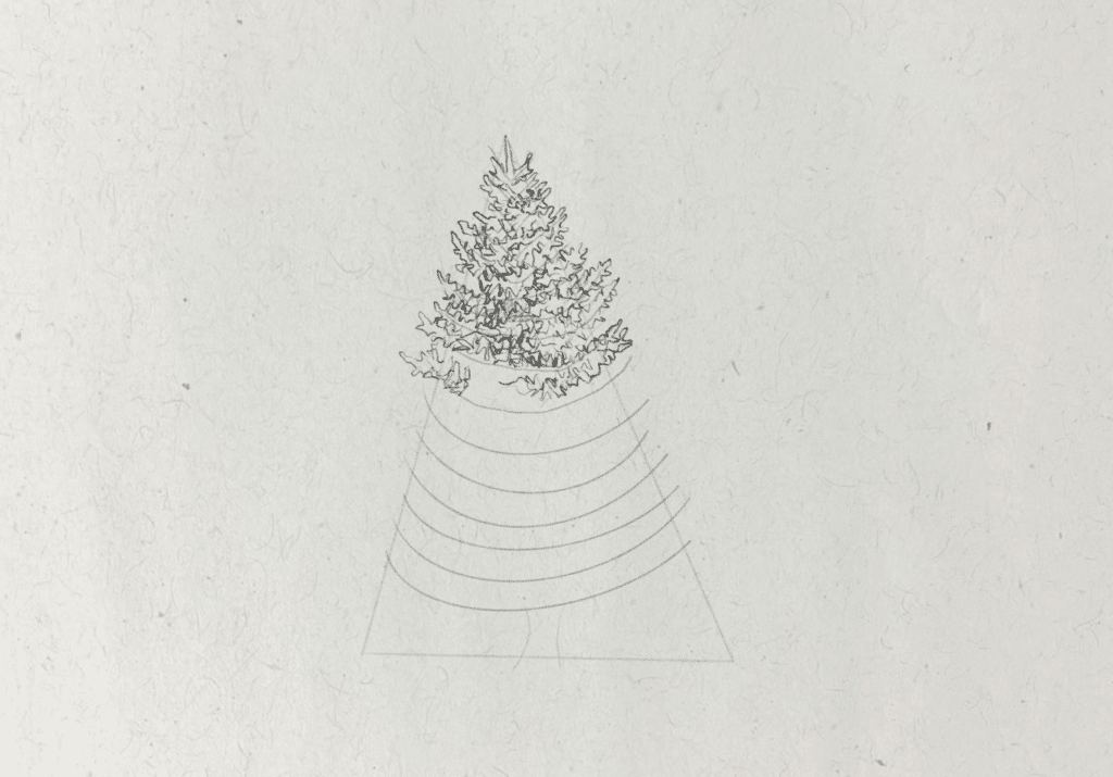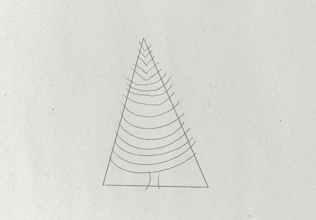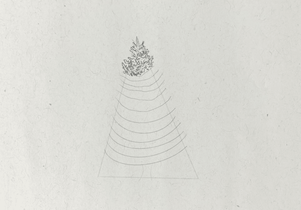 To start, I want to find the most basic shape that will represent the form of the tree. I draw a tall triangle shape, which isn’t perfectly symmetrical. The shape of the tree will broadly fit within this guide. Then I also draw two small curved lines at the bottom of this shape to represent the trunk.