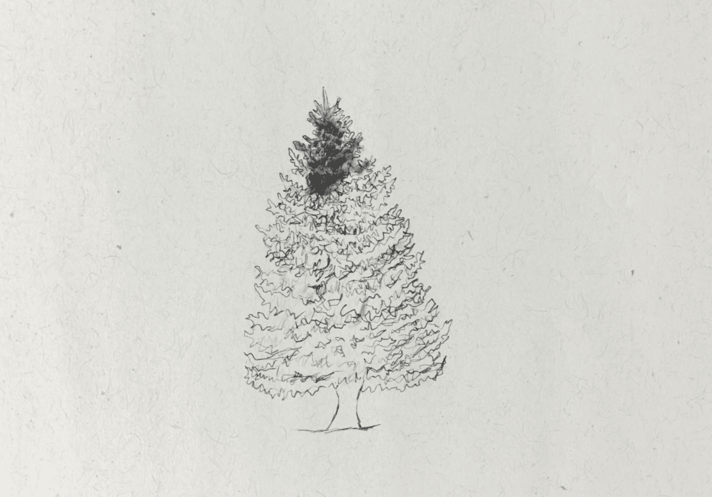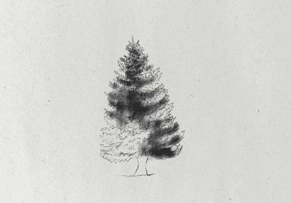 I continue using the side of the pencil in loose swirling patterns, applying darker shadows beneath the branches where shadows are being cast and creating lighter pressure for the mid shadow tones around the top of the branches. Some of the darkest shadows are concentrated around the middle of the fir tree, where branches overlap.