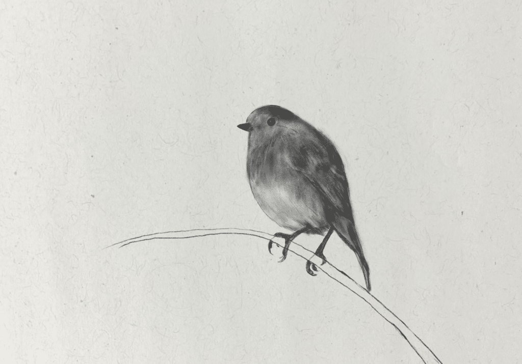 I chose to create a graphite pencil sketch, so I first established the light source, which was coming from above and in front of the robin, then I concentrated the darker areas around the feathers that were casting shadows, around the tail and the chest of the bird to create volume. Using the side of the pencil helped me lay down the shading more quickly and I used a tortillion and a kneaded eraser to blend and create subtle highlights on the feathers.
